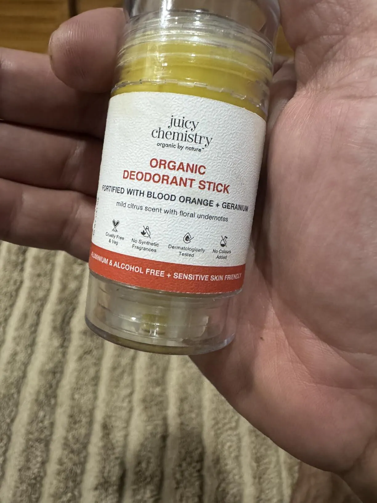 This Organic Deodorant Stick is crafted by Juicy Chemistry, a trusted organic skincare brand known for its COSMOS-certified formulations.